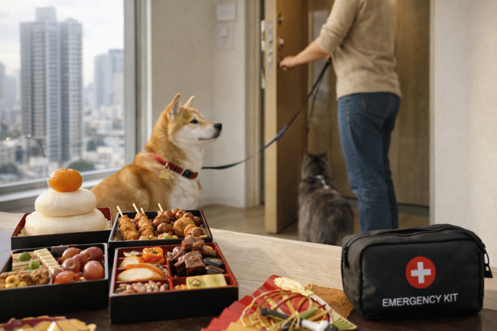 お正月は誤食(食べてはいけない物を食べること)と迷子が増えやすい時期です。おもち、串、骨、から揚げの脂、チョコ、玉ねぎ、ぶどう、キシリトール入り菓子などは犬猫に危険なので、テーブルの上でも放置しないでください。中毒になりやすい食べ物の整理はASPCAのリストが参考になります。さらに、初詣や来客で玄関が開く回数が増えると脱走リスクが上がります。高層マンションでは廊下や非常階段に出ると、探すのが難しくなることも。環境省の制度では犬猫のマイクロチップ登録が案内されています。装着済みの子は「登録情報が今の連絡先か」を確認しましょう。首輪の迷子札、キャリーに慣らす練習、エレベーターで静かに待つ練習も、災害時の避難に役立ちます。ベランダは落下事故があるので、網戸ストッパー等で開けっぱなし防止。誤食時は「物・量・時間」をメモして受診。緊急連絡先も確認しましょう。